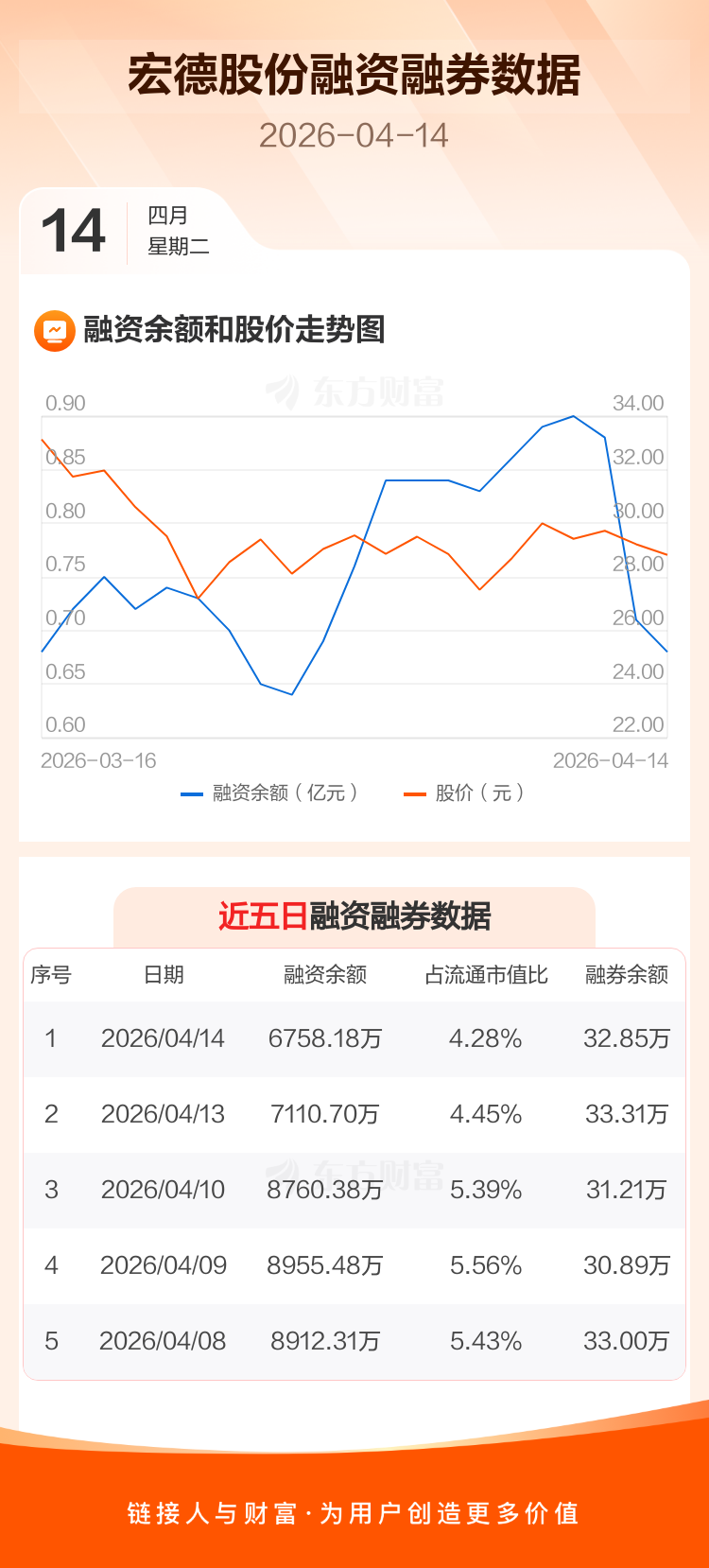 交易所最新数据显示,宏德股份于2026年4月14日获融资买入993.64万元,融资偿还1346.16万元,当日融资净偿还352.52万元。目前,该股融资余额6758.18万,占流通市值比例为4.28%。