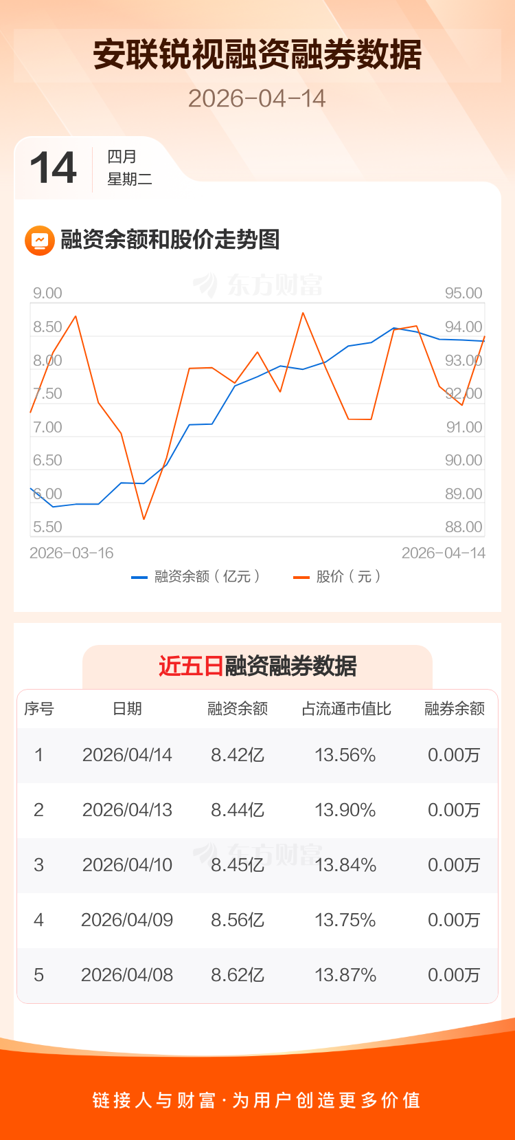 交易所最新数据显示,安联锐视于2026年4月14日获融资买入2590.76万元,融资偿还2780.32万元,当日融资净偿还189.56万元。目前,该股融资余额8.42亿,占流通市值比例为13.56%。