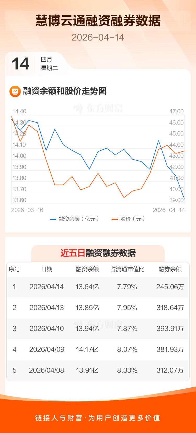 交易所最新数据显示,慧博云通于2026年4月14日获融资买入3194.13万元,融资偿还5206.60万元,当日融资净偿还2012.47万元。目前,该股融资余额13.64亿,占流通市值比例为7.79%。