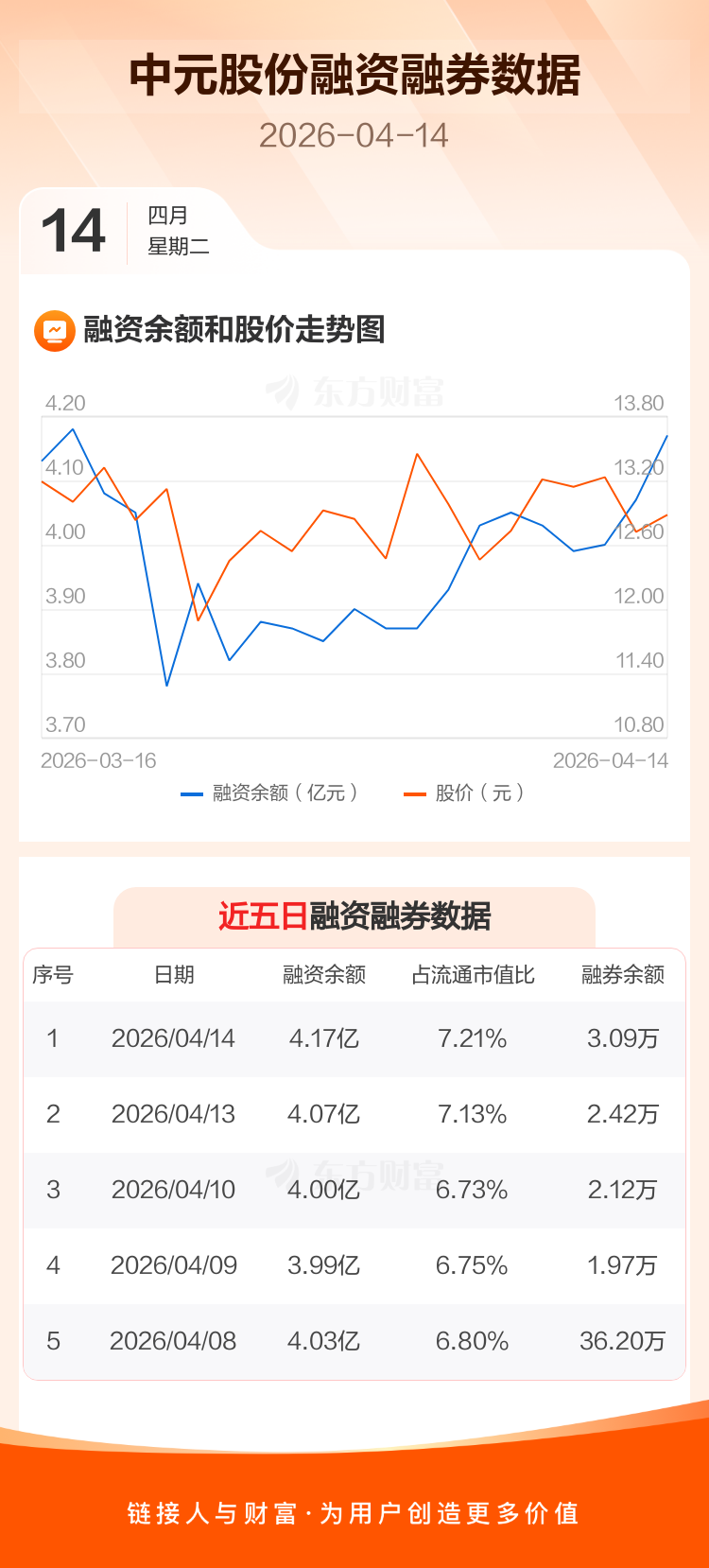 交易所最新数据显示,中元股份于2026年4月14日获融资买入3408.47万元,融资偿还2433.12万元,当日融资净买入975.35万元。目前,该股融资余额4.17亿,占流通市值比例为7.21%。