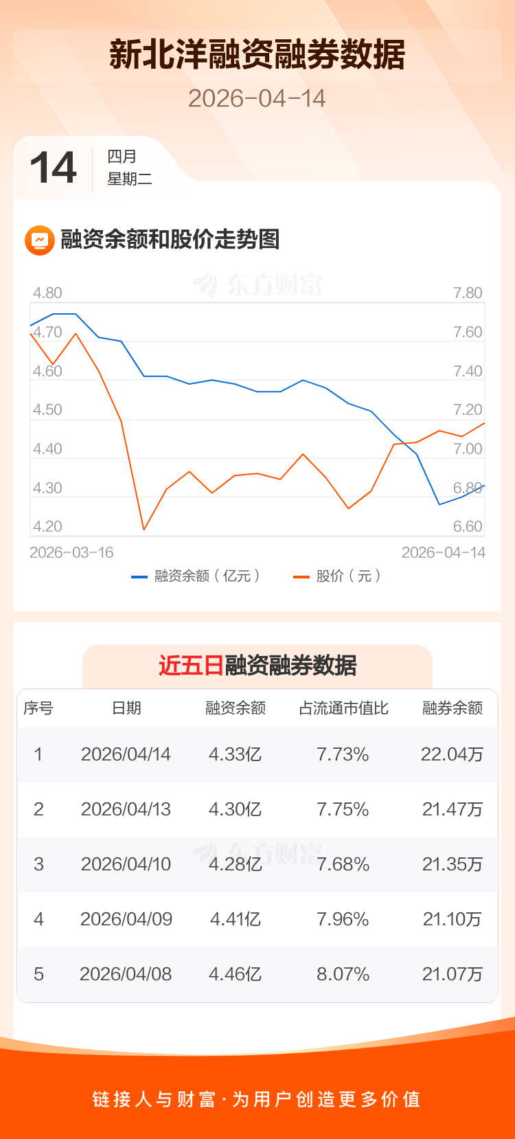交易所最新数据显示,新北洋于2026年4月14日获融资买入1003.09万元,融资偿还705.69万元,当日融资净买入297.4万元。目前,该股融资余额4.33亿,占流通市值比例为7.73%。