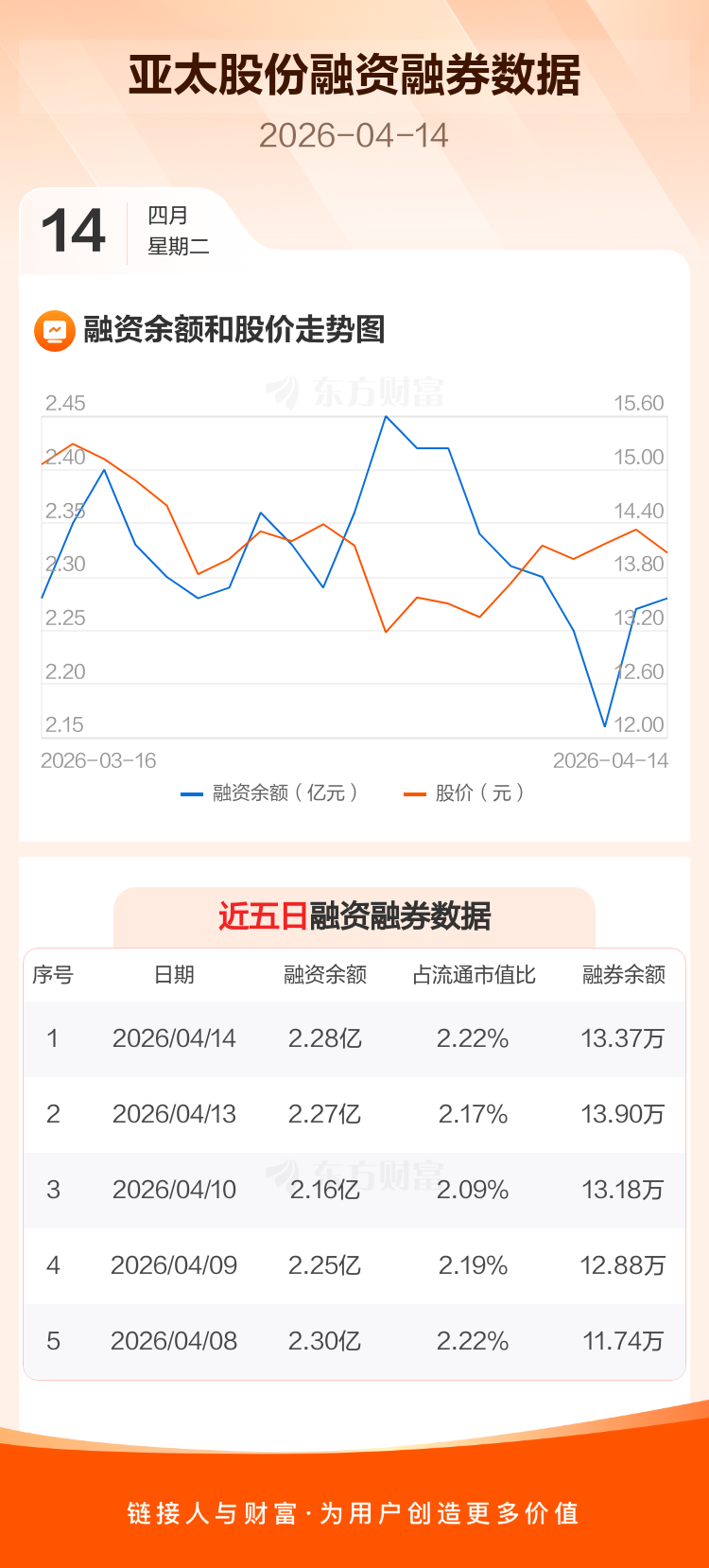 交易所最新数据显示,亚太股份于2026年4月14日获融资买入1997.51万元,融资偿还1879.23万元,当日融资净买入118.29万元。目前,该股融资余额2.28亿,占流通市值比例为2.22%。
