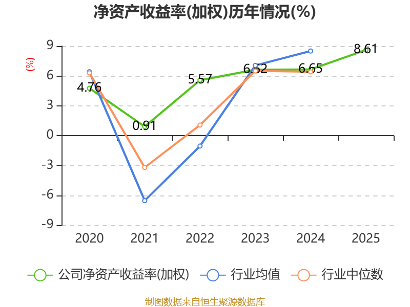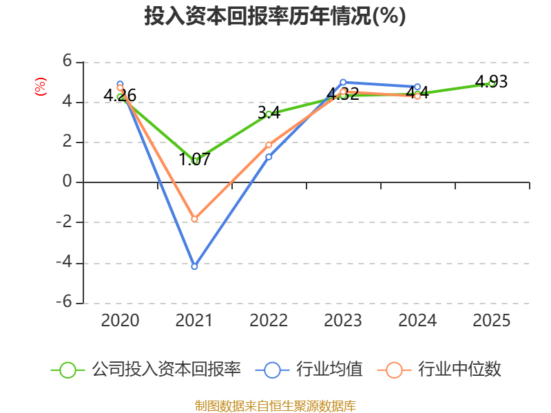数据显示,2025年公司加权平均净资产收益率为8.61%,较上年同期上升1.96个百分点。公司2025年投入资本回报率为4.93%,较上年同期上升0.53个百分点。