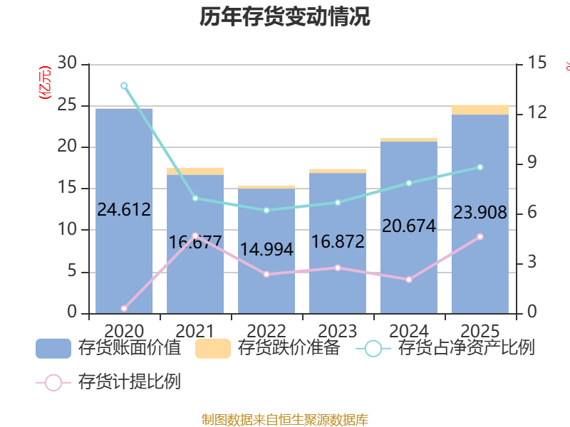 从存货变动来看,截至2025年末,公司存货账面价值为23.91亿元,占净资产的8.79%,较上年末增加3.23亿元。其中,存货跌价准备为1.15亿元,计提比例为4.6%。