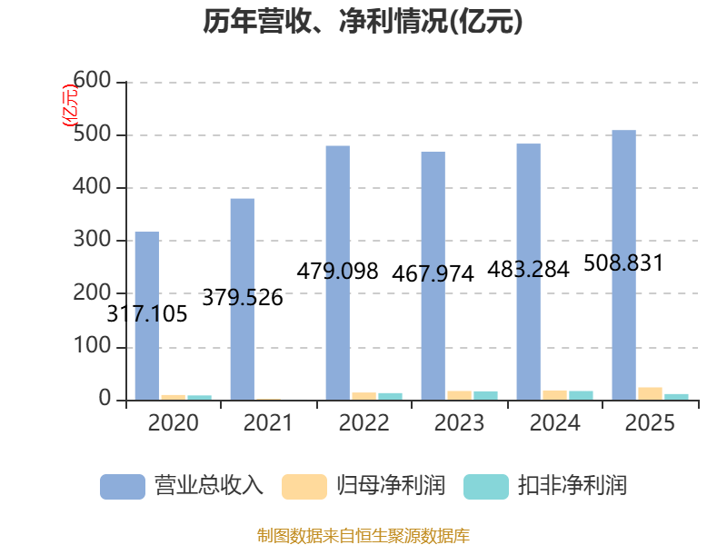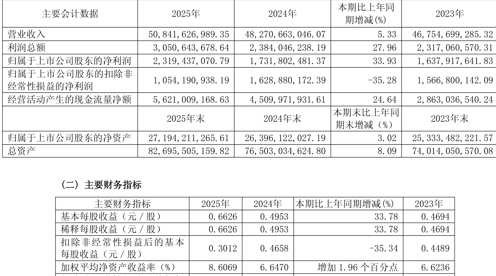 中证智能财讯广州发展(600098)4月15日披露2025年年度报告。2025年,公司实现营业总收入508.83亿元,同比增长5.29%;归母净利润23.19亿元,同比增长33.93%;扣非净利润10.54亿元,同比下降35.28%;经营活动产生的现金流量净额为56.21亿元,同比增长24.64%;报告期内,广州发展基本每股收益为0.6626元,加权平均净资产收益率为8.61%。公司2025年度分配预案为:拟向全体股东每10股派现2.5元(含税)。