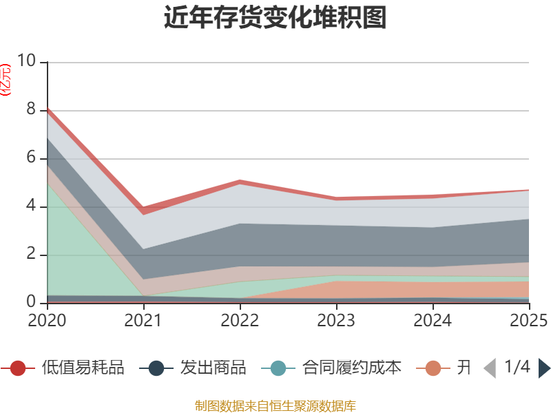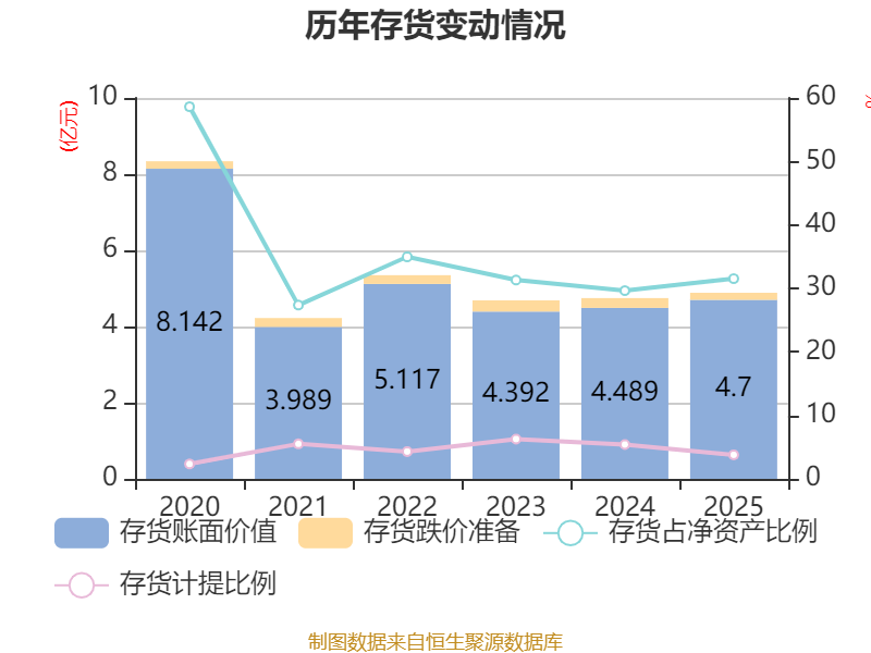 从存货变动来看,截至2025年末,公司存货账面价值为4.7亿元,占净资产的31.54%,较上年末增加2106.72万元。其中,存货跌价准备为1845.1万元,计提比例为3.78%。