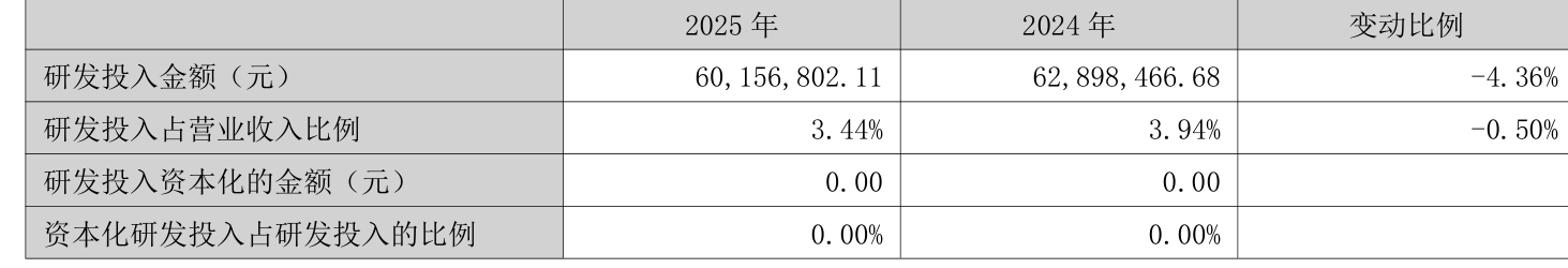 2025年全年,公司研发投入金额为6015.68万元,同比下降4.36%;研发投入占营业收入比例为3.44%,相比上年同期下降0.5个百分点。此外,公司全年研发投入资本化率为0%。
