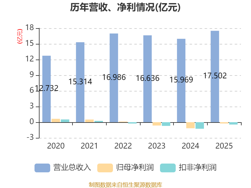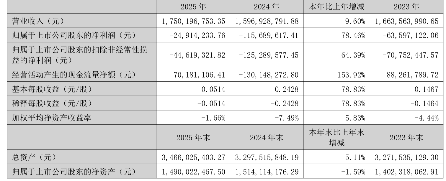 中证智能财讯川润股份(002272)4月15日披露2025年年度报告。2025年,公司实现营业总收入17.5亿元,同比增长9.60%;归母净利润亏损2491.42万元,上年同期亏损1.16亿元;扣非净利润亏损4461.93万元,上年同期亏损1.25亿元;经营活动产生的现金流量净额为7018.11万元,上年同期为-1.3亿元;报告期内,川润股份基本每股收益为-0.0514元,加权平均净资产收益率为-1.66%。