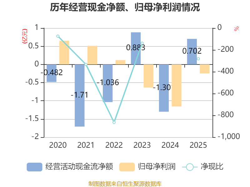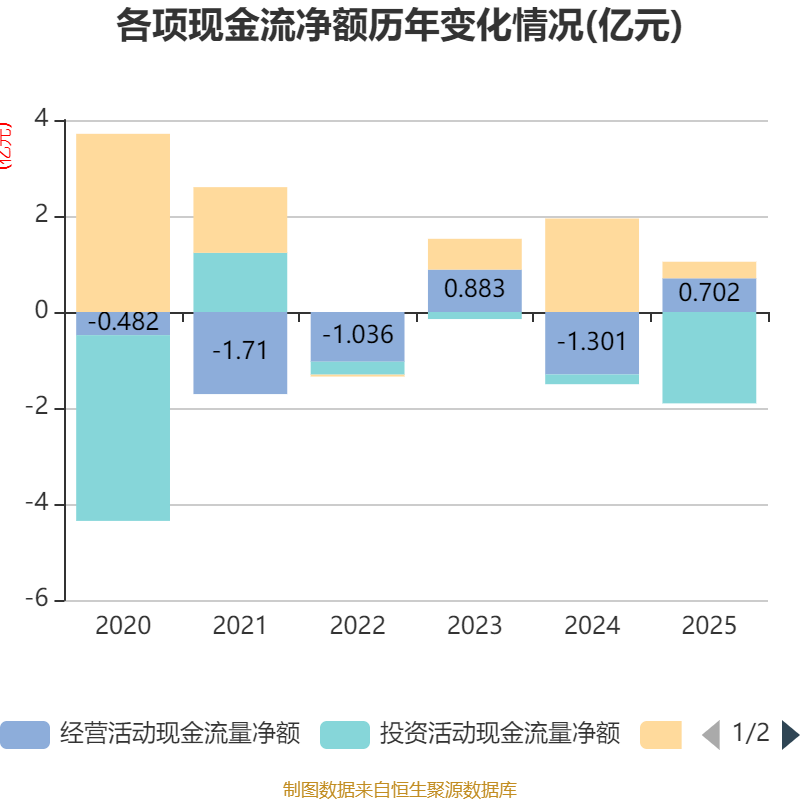 截至2025年,公司经营活动现金流净额为7018.11万元,同比增加2亿元;筹资活动现金流净额3451.3万元,同比减少1.6亿元;投资活动现金流净额-1.9亿元,上年同期为-2026.17万元。