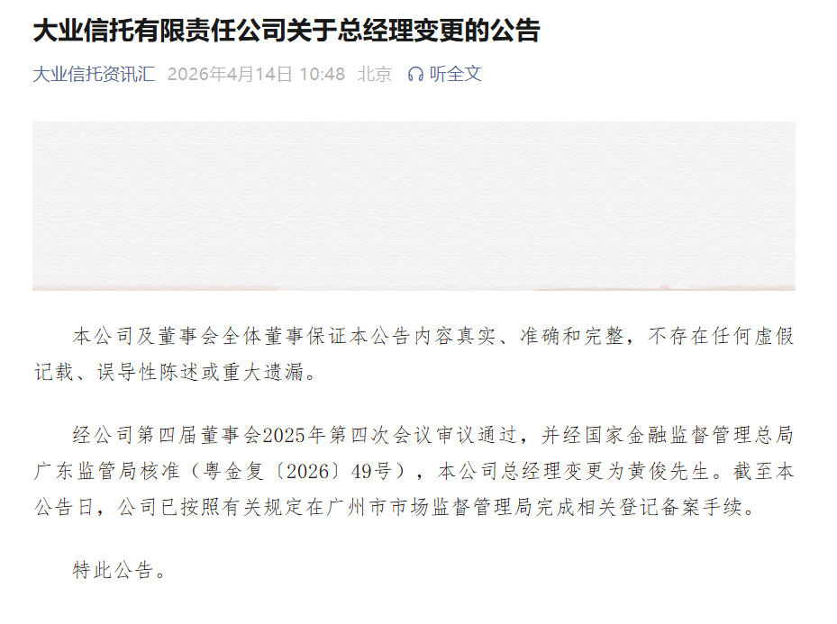 4月14日,大业信托发布公告称,经该公司第四届董事会2025年第四次会议审议通过,并经国家金融监督管理总局广东监管局核准,该公司总经理变更为黄俊。