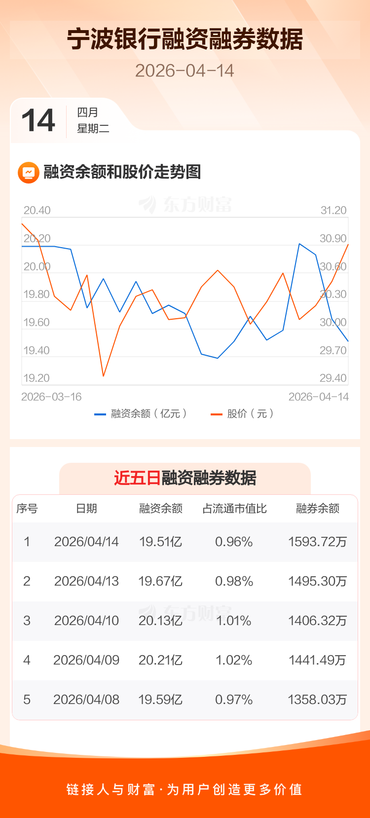 交易所最新数据显示,宁波银行于2026年4月14日获融资买入2970.32万元,融资偿还4521.26万元,当日融资净偿还1550.94万元。目前,该股融资余额19.51亿,占流通市值比例为0.96%。