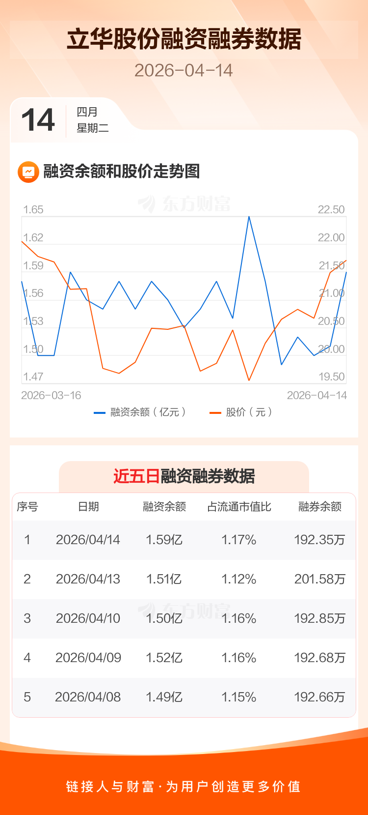 交易所最新数据显示,立华股份于2026年4月14日获融资买入2358.34万元,融资偿还1554.49万元,当日融资净买入803.85万元。目前,该股融资余额1.59亿,占流通市值比例为1.17%。