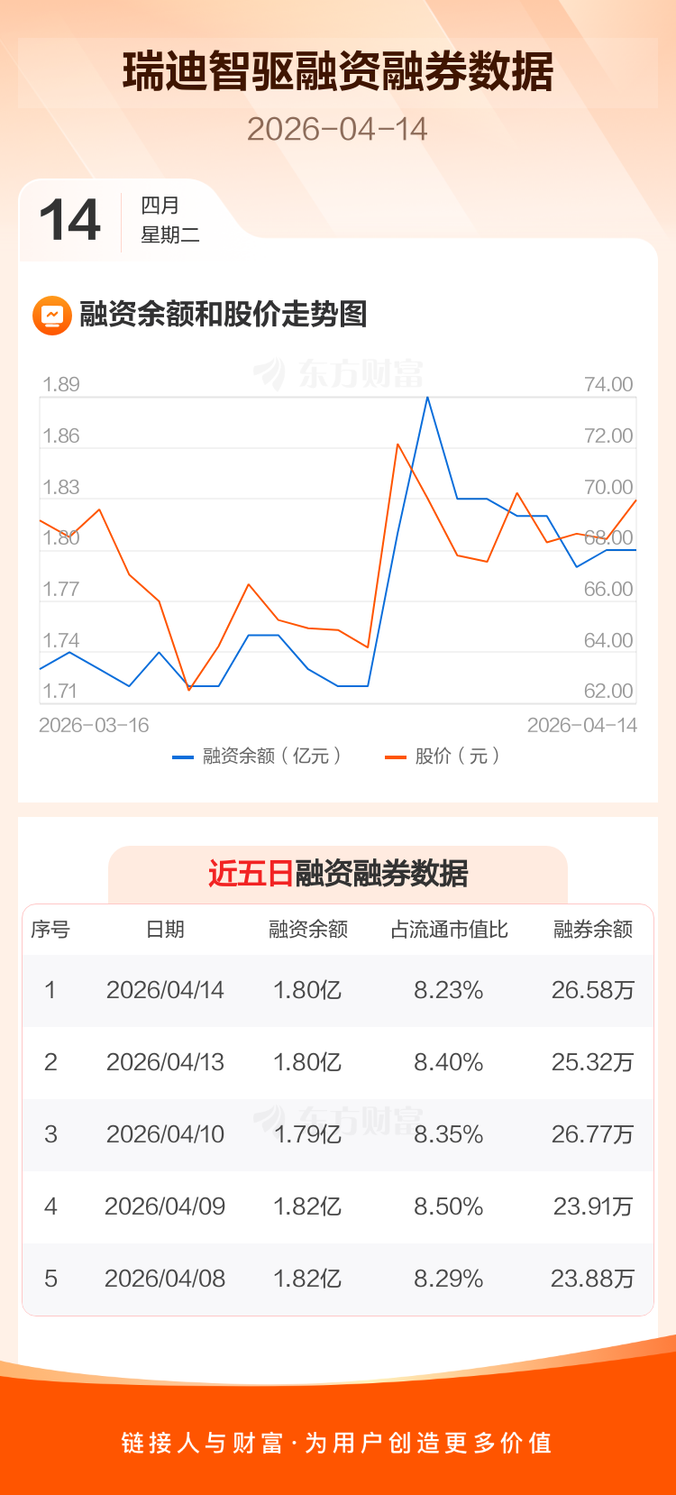 交易所最新数据显示,瑞迪智驱于2026年4月14日获融资买入614.05万元,融资偿还568.16万元,当日融资净买入45.89万元。目前,该股融资余额1.80亿,占流通市值比例为8.23%。
