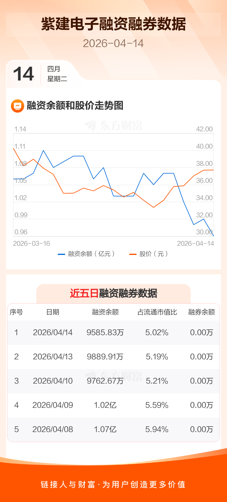 交易所最新数据显示,紫建电子于2026年4月14日获融资买入273.57万元,融资偿还577.65万元,当日融资净偿还304.08万元。目前,该股融资余额9585.83万,占流通市值比例为5.02%。