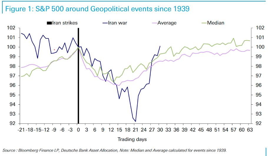 在伊朗冲突爆发初期,德意志银行分析师团队制作的一份表格引发了广泛关注。数据显示,地缘政治冲击引发的股市抛售中,标普500指数通常会在接下来三周内下跌6%至8%,随后便开始收复失地。