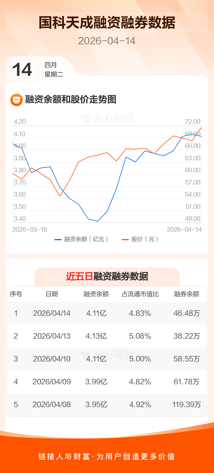 交易所最新数据显示,国科天成于2026年4月14日获融资买入3124.49万元,融资偿还3250.59万元,当日融资净偿还126.1万元。目前,该股融资余额4.11亿,占流通市值比例为4.83%。