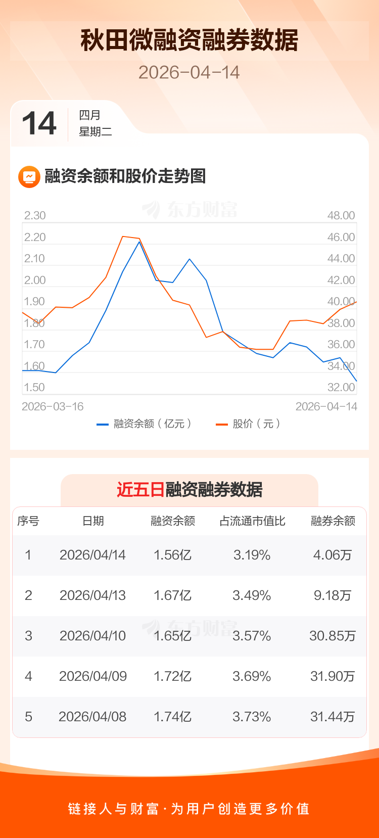 交易所最新数据显示,秋田微于2026年4月14日获融资买入2229.74万元,融资偿还3391.23万元,当日融资净偿还1161.49万元。目前,该股融资余额1.56亿,占流通市值比例为3.19%。