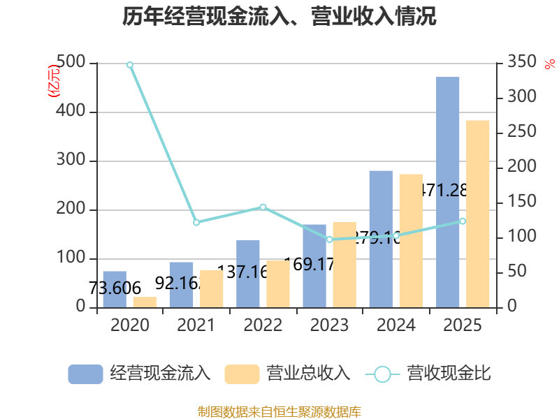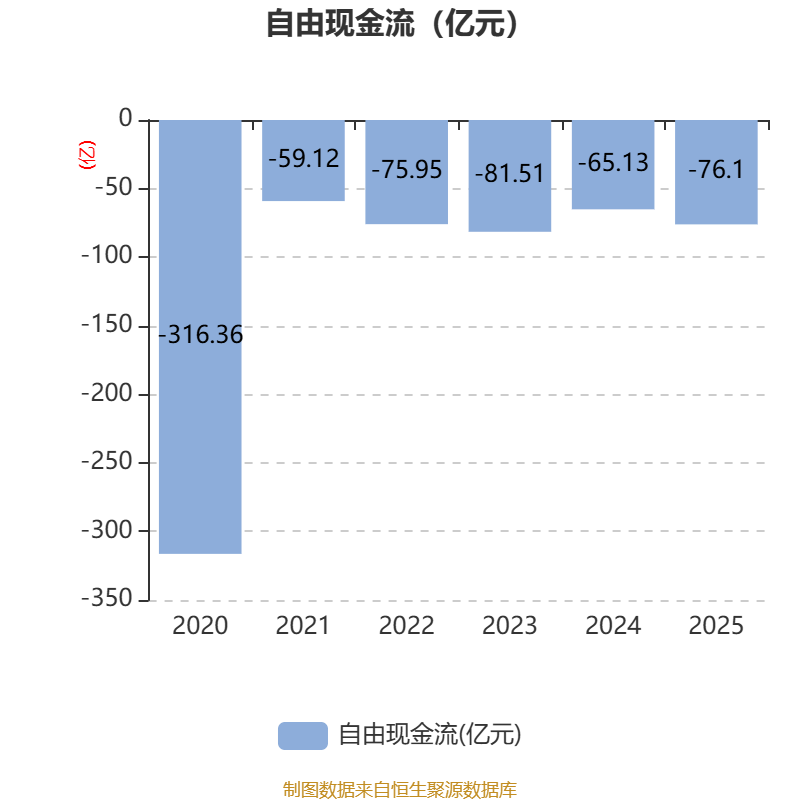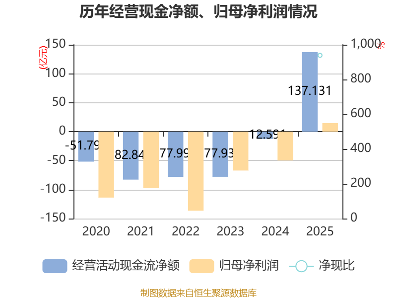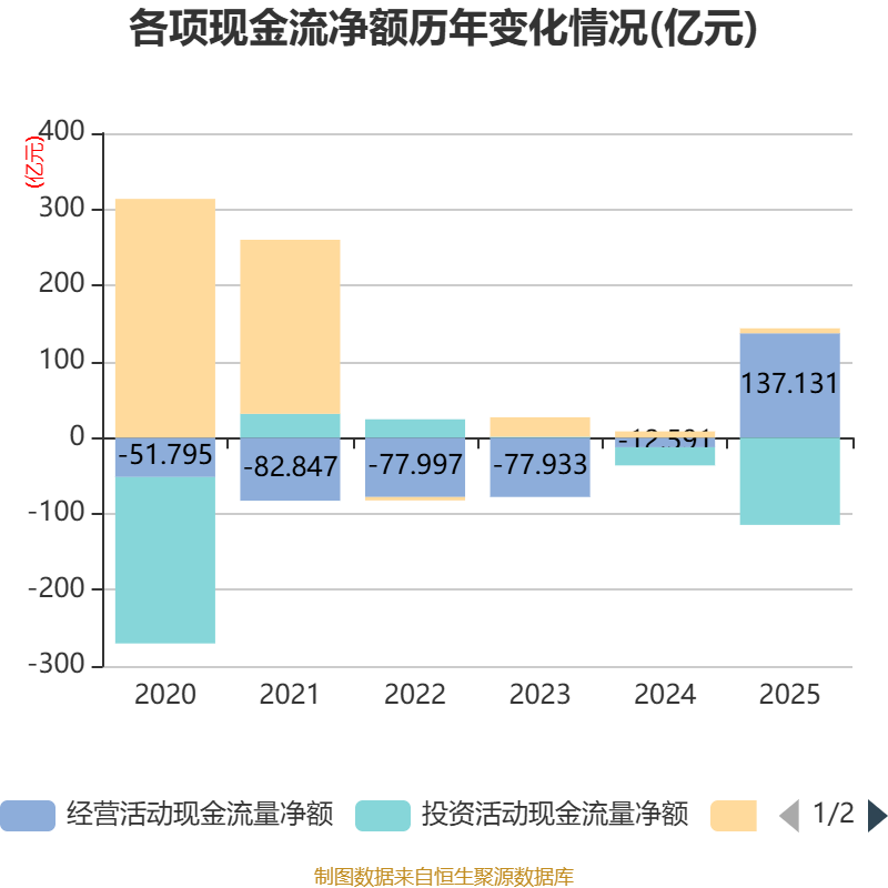 截至2025年,公司经营活动现金流净额为137.13亿元,同比增加149.72亿元;筹资活动现金流净额6.52亿元,同比减少1.75亿元;投资活动现金流净额-114.61亿元,上年同期为-23.89亿元。