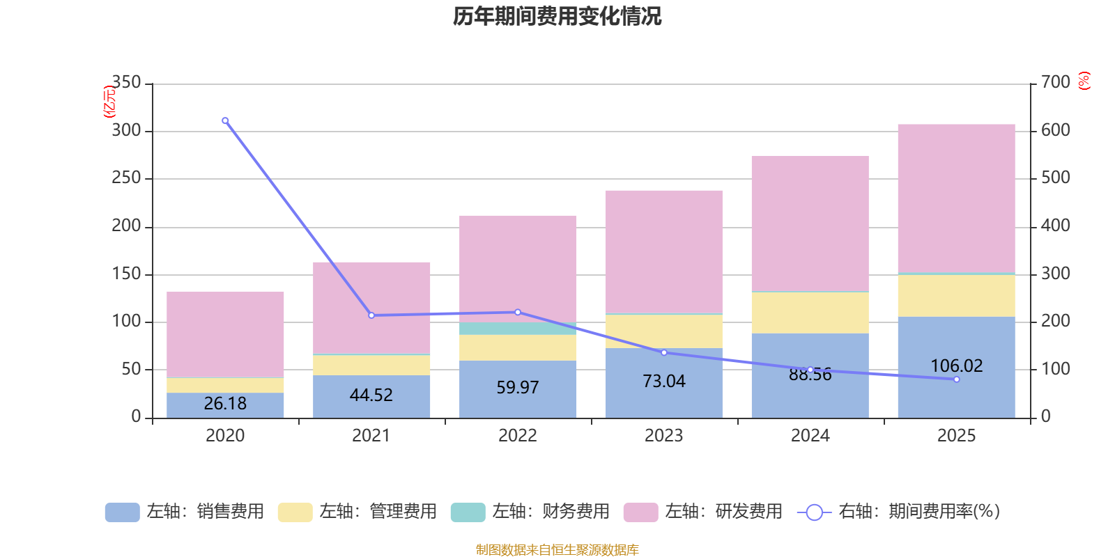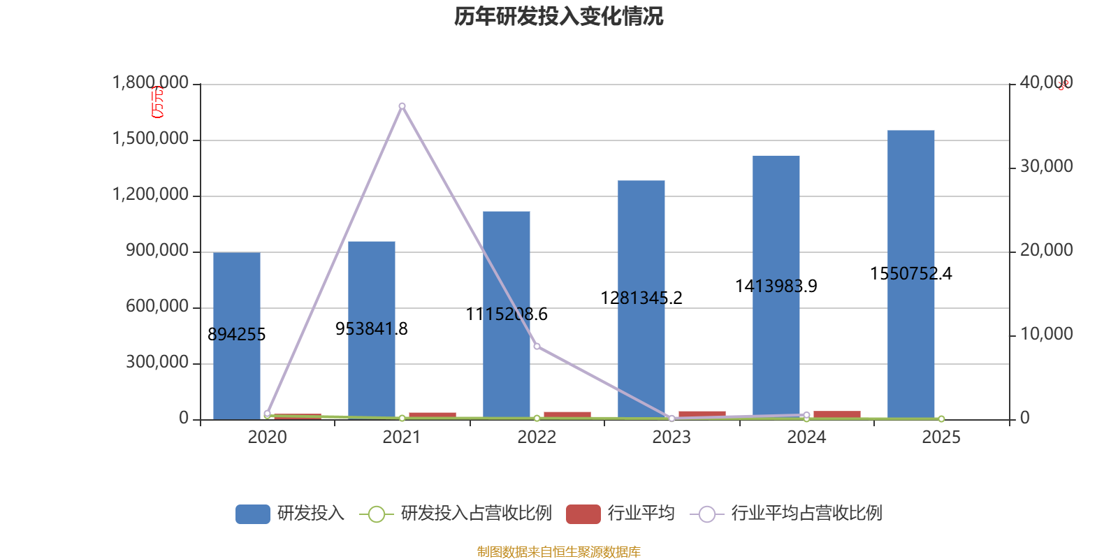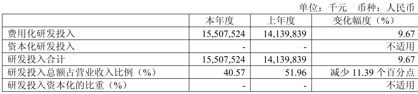 2025年全年,公司研发投入金额为155.08亿元,同比增长9.67%;研发投入占营业收入比例为40.57%,相比上年同期下降11.39个百分点。