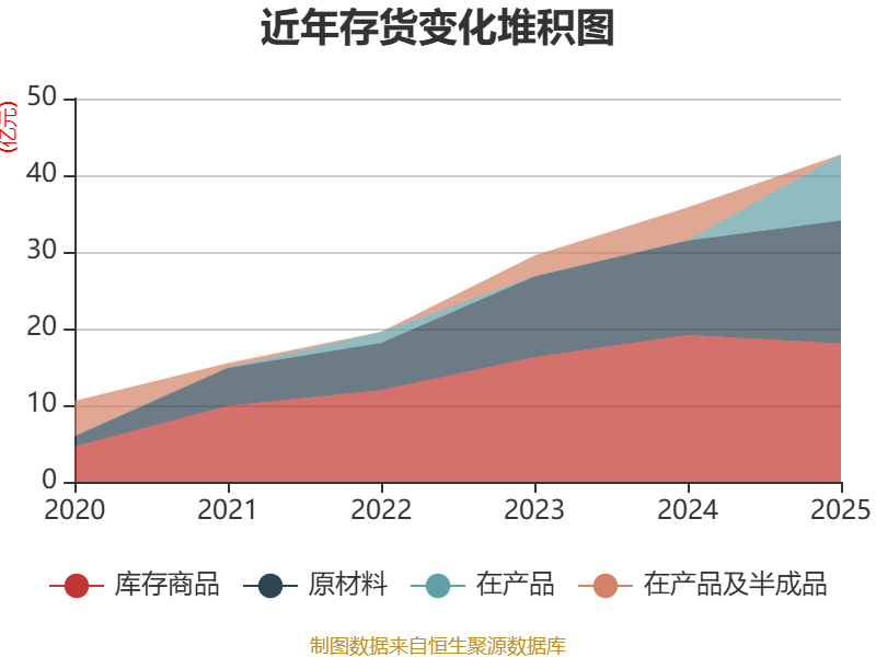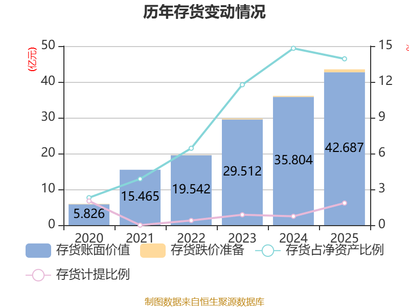 从存货变动来看,截至2025年末,公司存货账面价值为42.69亿元,占净资产的13.93%,较上年末增加6.88亿元。其中,存货跌价准备为8063.1万元,计提比例为1.85%。
