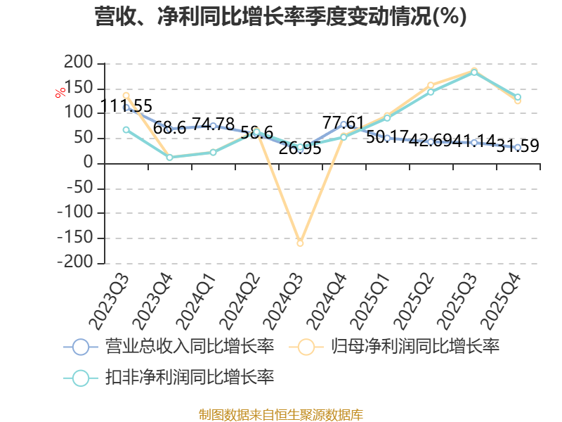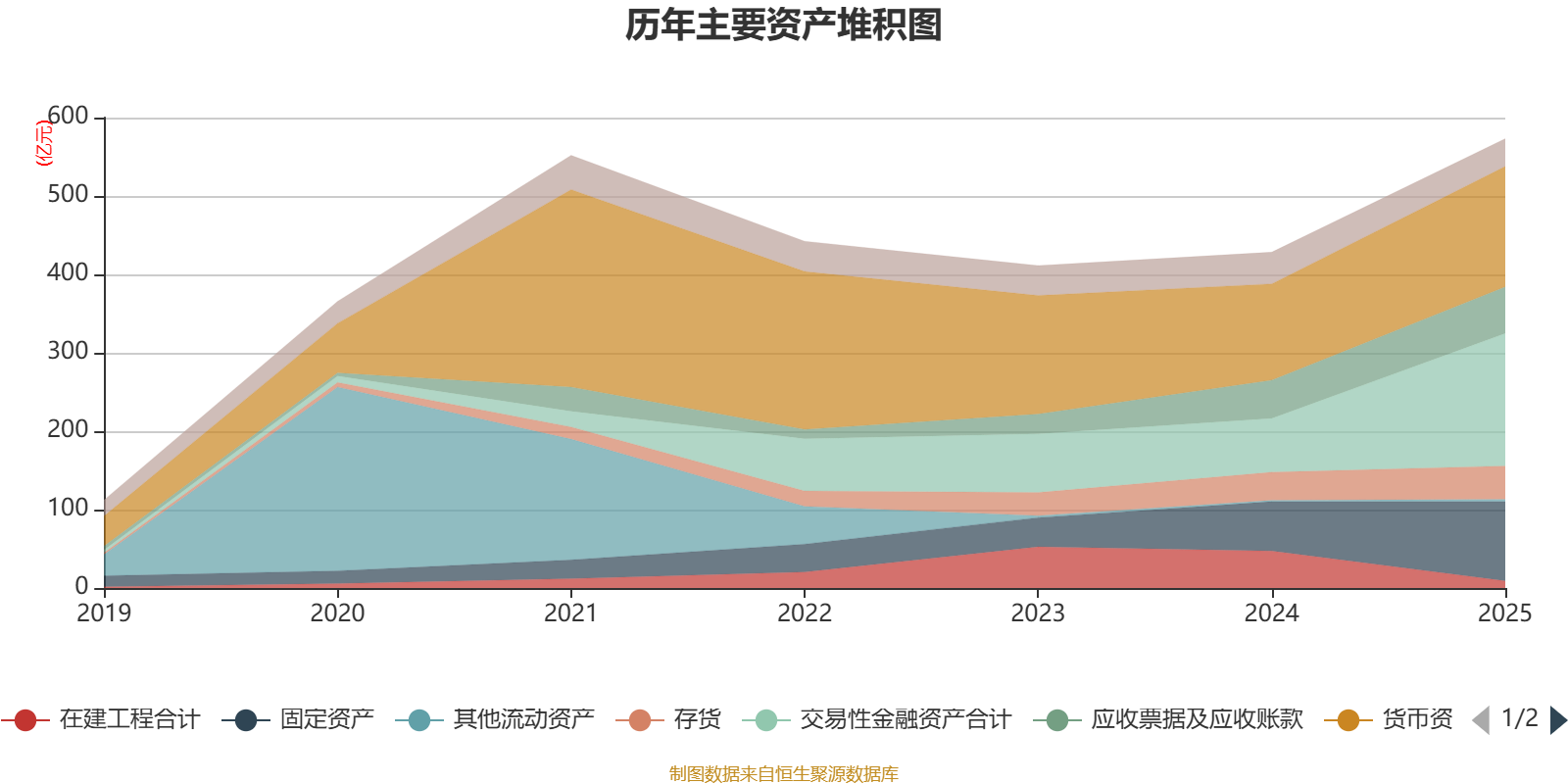 资产重大变化方面,截至2025年末,公司交易性金融资产合计较上年末增加146.35%,占公司总资产比重上升13.46个百分点;在建工程合计较上年末减少81.08%,占公司总资产比重下降9.46个百分点;固定资产较上年末增加60.41%,占公司总资产比重上升2.93个百分点;货币资金较上年末增加25.11%,占公司总资产比重下降1.86个百分点。