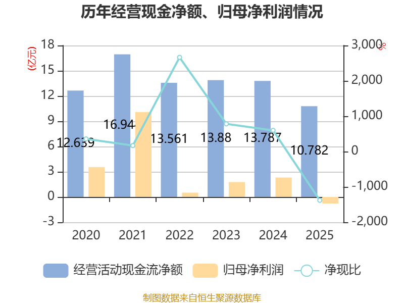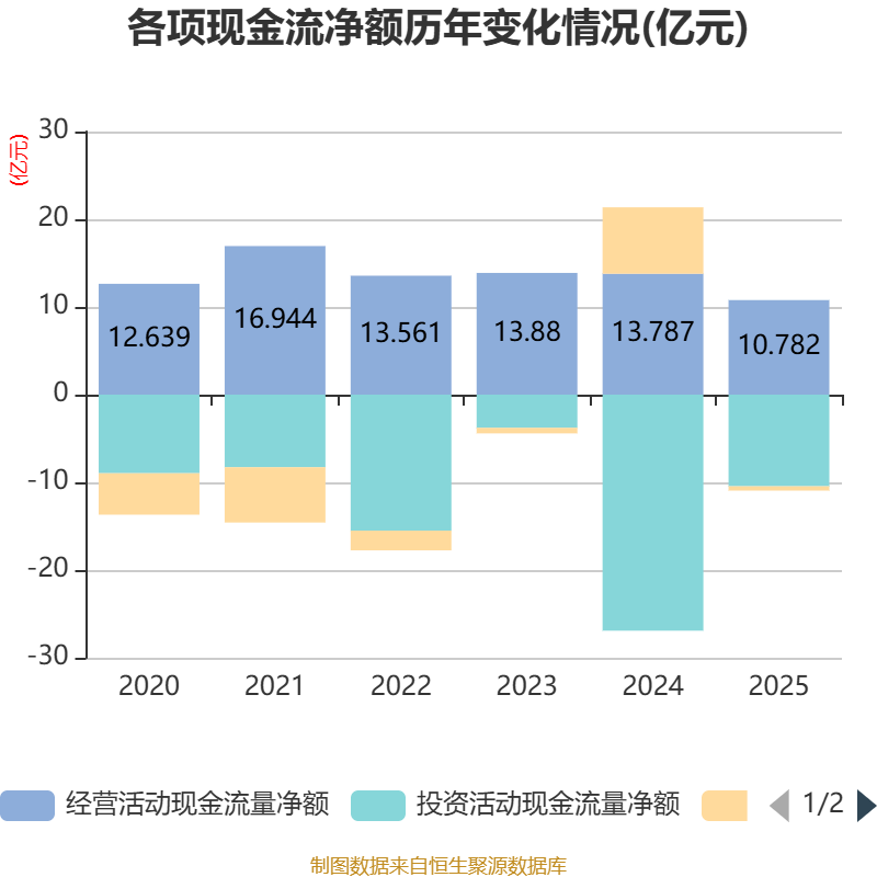 截至2025年,公司经营活动现金流净额为10.78亿元,同比下降21.8%;筹资活动现金流净额-4932.09万元,同比减少8.07亿元;投资活动现金流净额-10.45亿元,上年同期为-26.91亿元。