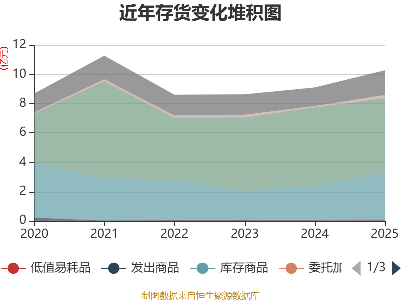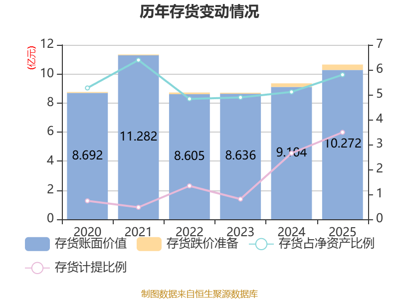 从存货变动来看,截至2025年末,公司存货账面价值为10.27亿元,占净资产的5.8%,较上年末增加1.17亿元。其中,存货跌价准备为3716.53万元,计提比例为3.49%。