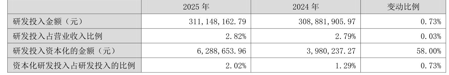 2025年全年,公司研发投入金额为3.11亿元,同比增长0.73%;研发投入占营业收入比例为2.82%,相比上年同期上升0.03个百分点。此外,公司全年研发投入资本化率为2.02%。