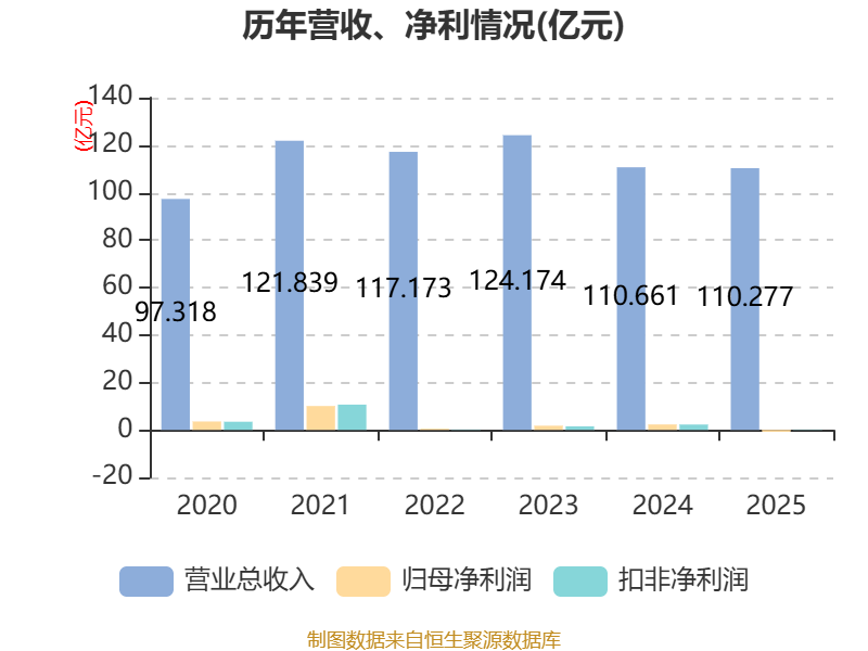 中证智能财讯诚志股份(000990)4月15日披露2025年年度报告。2025年,公司实现营业总收入110.28亿元,同比下降0.35%;归母净利润亏损7814.27万元,上年同期盈利2.31亿元;扣非净利润1700.66万元,同比下降92.50%;经营活动产生的现金流量净额为10.78亿元,同比下降21.80%;报告期内,诚志股份基本每股收益为-0.0643元,加权平均净资产收益率为-0.44%。公司2025年度分配预案为:拟向全体股东每10股转4股。
