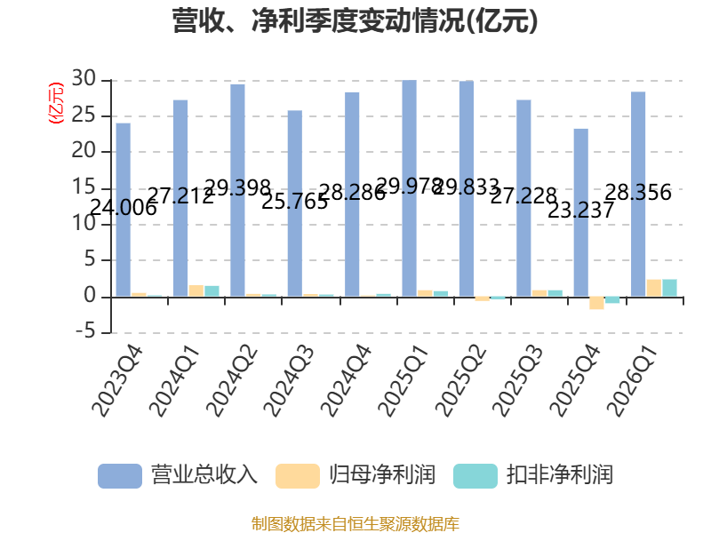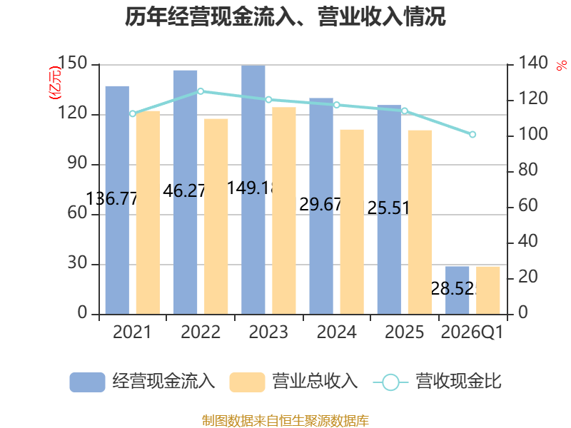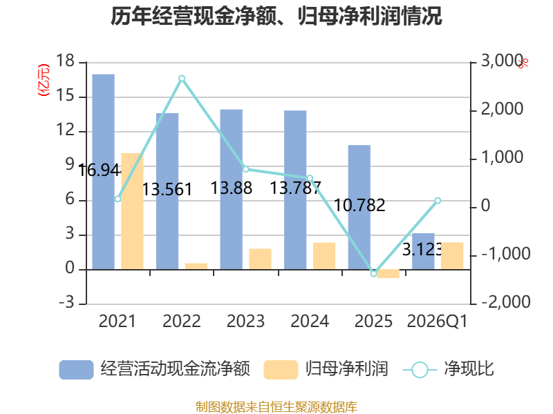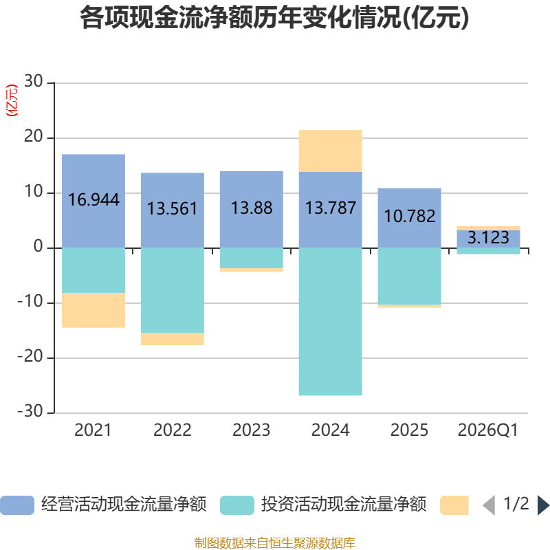 截至2026年一季度末,公司经营活动现金流净额为3.12亿元,同比下降30.81%;筹资活动现金流净额7707.01万元,同比增加3.87亿元;投资活动现金流净额-1.22亿元,上年同期为8.75亿元。