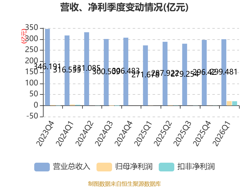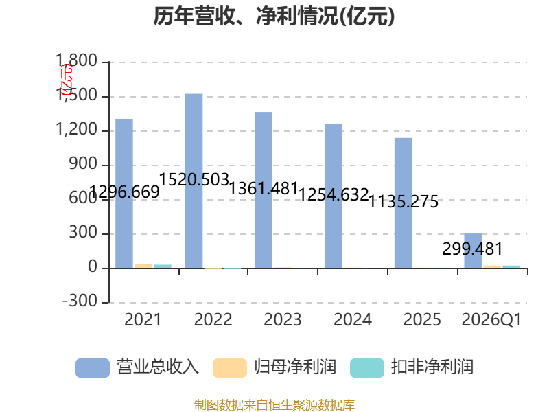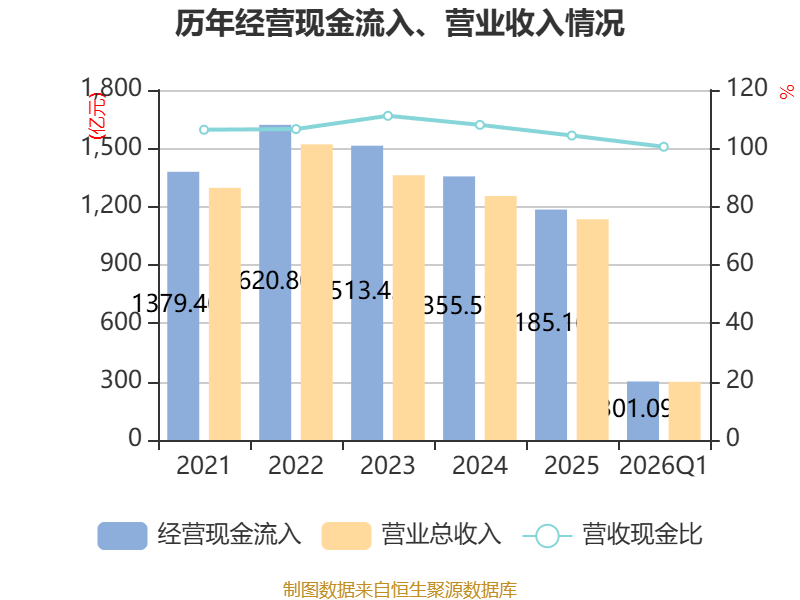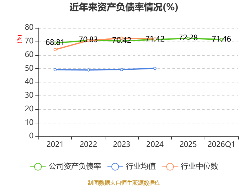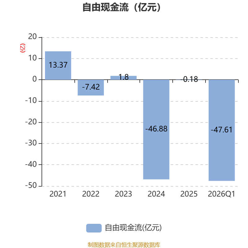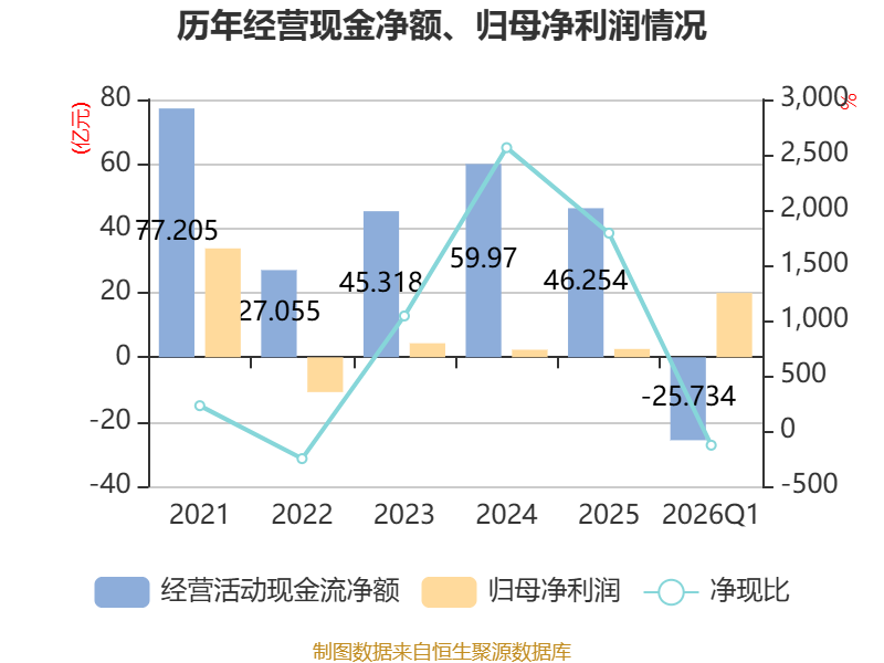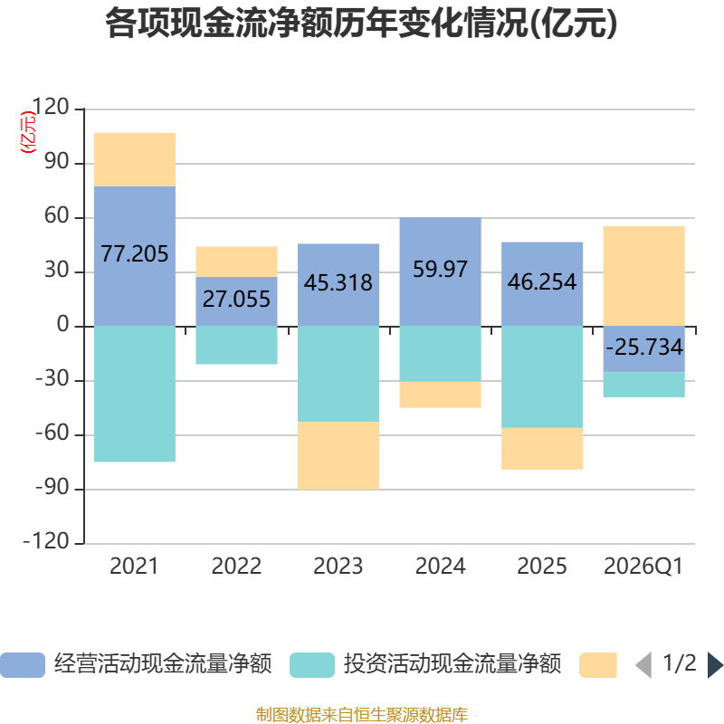 截至2026年一季度末,公司经营活动现金流净额为-25.73亿元,同比增加12.66亿元;筹资活动现金流净额55.07亿元,同比增加22.22亿元;投资活动现金流净额-13.76亿元,上年同期为-11.34亿元。