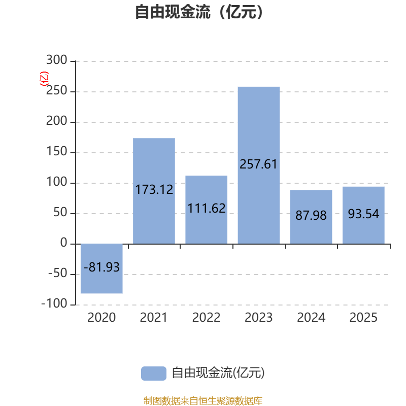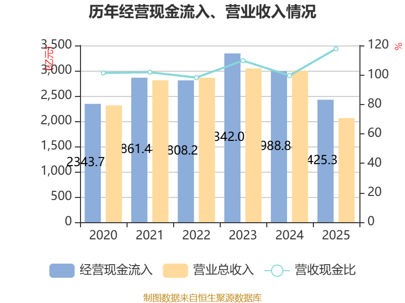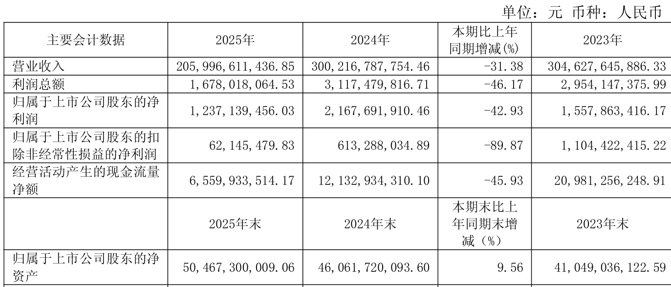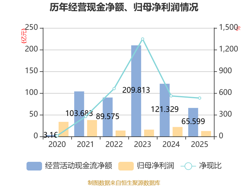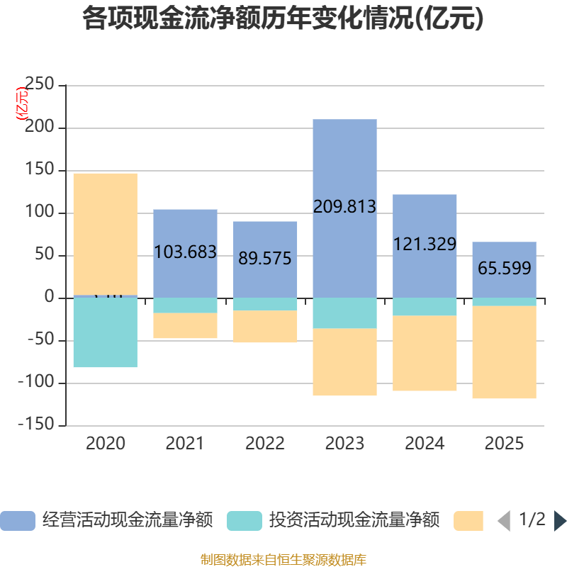 截至2025年,公司经营活动现金流净额为65.6亿元,同比下降45.93%;筹资活动现金流净额-108.63亿元,同比减少20.45亿元;投资活动现金流净额-9.81亿元,上年同期为-21.29亿元。
