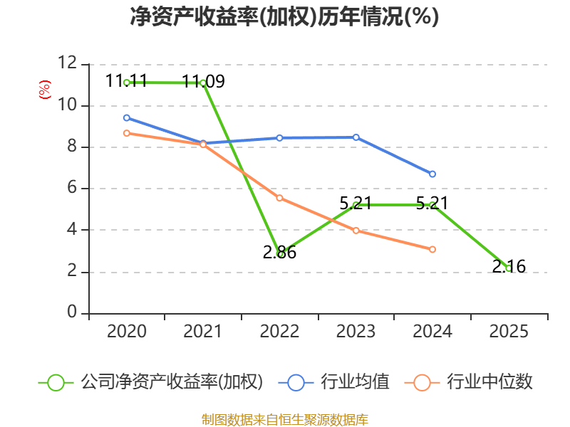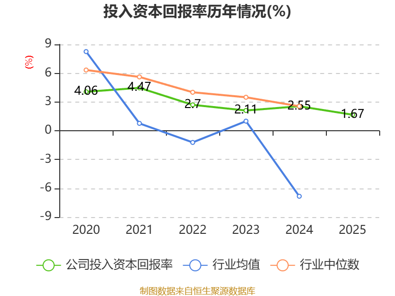 数据显示,2025年公司加权平均净资产收益率为2.16%,较上年同期下降3.05个百分点。公司2025年投入资本回报率为1.67%,较上年同期下降0.88个百分点。