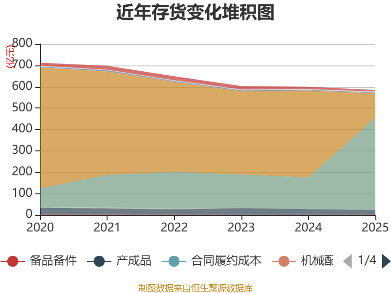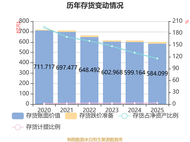 从存货变动来看,截至2025年末,公司存货账面价值为584.1亿元,占净资产的115.74%,较上年末减少15.07亿元。其中,存货跌价准备为17.14亿元,计提比例为2.85%。