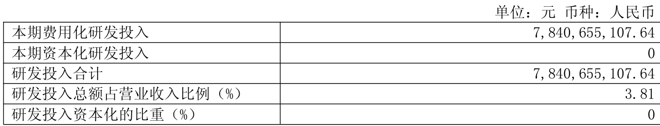 2025年全年,公司研发投入金额为78.41亿元,同比下降29.43%;研发投入占营业收入比例为3.81%,相比上年同期上升0.11个百分点。此外,公司全年研发投入资本化率为0%。