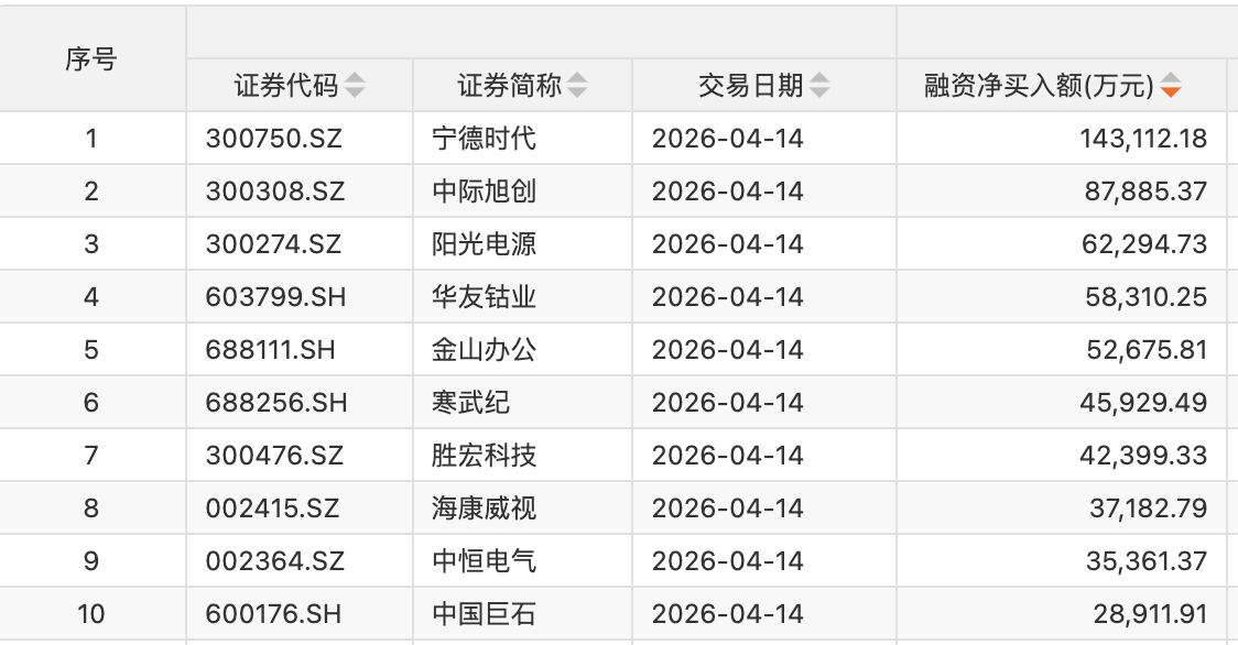个股方面,50只股获融资净买入额超1亿元。宁德时代获融资净买入额居首,净买入14.31亿元;融资净买入金额居前的还有中际旭创、阳光电源、华友钴业、金山办公、寒武纪、胜宏科技、海康威视、中恒电气、中国巨石等。
