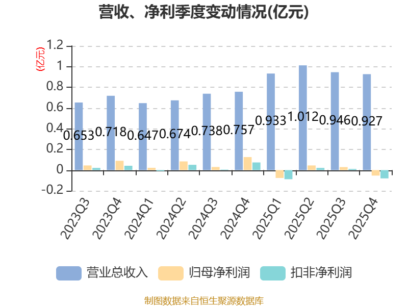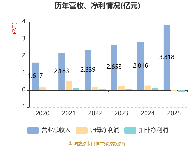 中证智能财讯北纬科技(002148)4月15日披露2025年年度报告。2025年,公司实现营业总收入3.82亿元,同比增长35.58%;归母净利润亏损561.07万元,上年同期盈利2618.58万元;扣非净利润亏损1369.47万元,上年同期盈利1202.65万元;经营活动产生的现金流量净额为-2052.97万元,上年同期为-690.77万元;报告期内,北纬科技基本每股收益为-0.01元,加权平均净资产收益率为-0.46%。