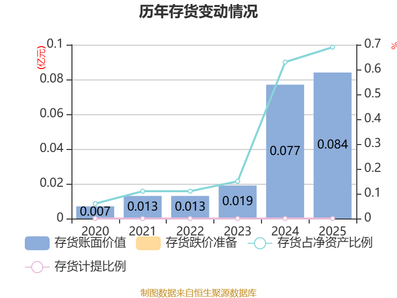 从存货变动来看,截至2025年末,公司存货账面价值为841.59万元,占净资产的0.69%,较上年末增加74.06万元。公司本期没有计提存货跌价准备。