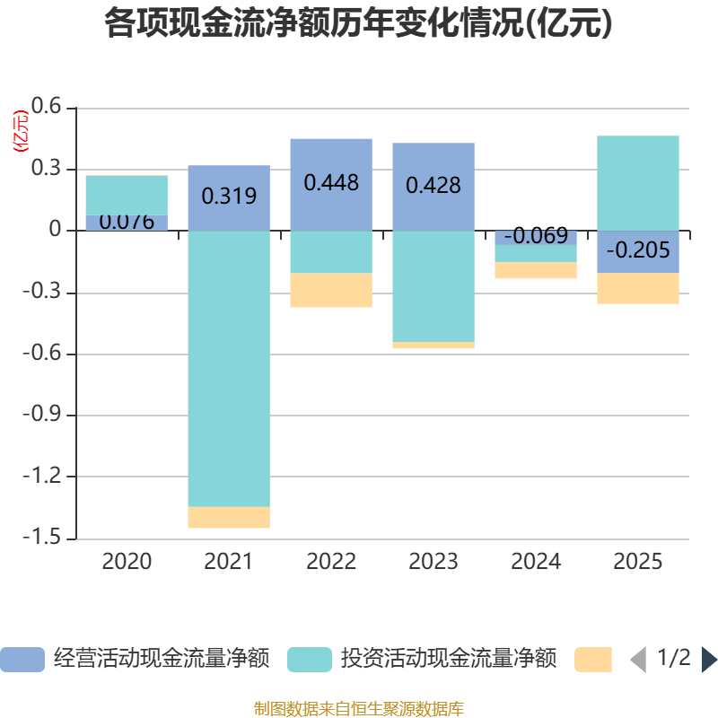 截至2025年,公司经营活动现金流净额为-2052.97万元,同比减少1362.2万元;筹资活动现金流净额-1511.39万元,同比减少727.4万元;投资活动现金流净额4626.77万元,上年同期为-854.07万元。