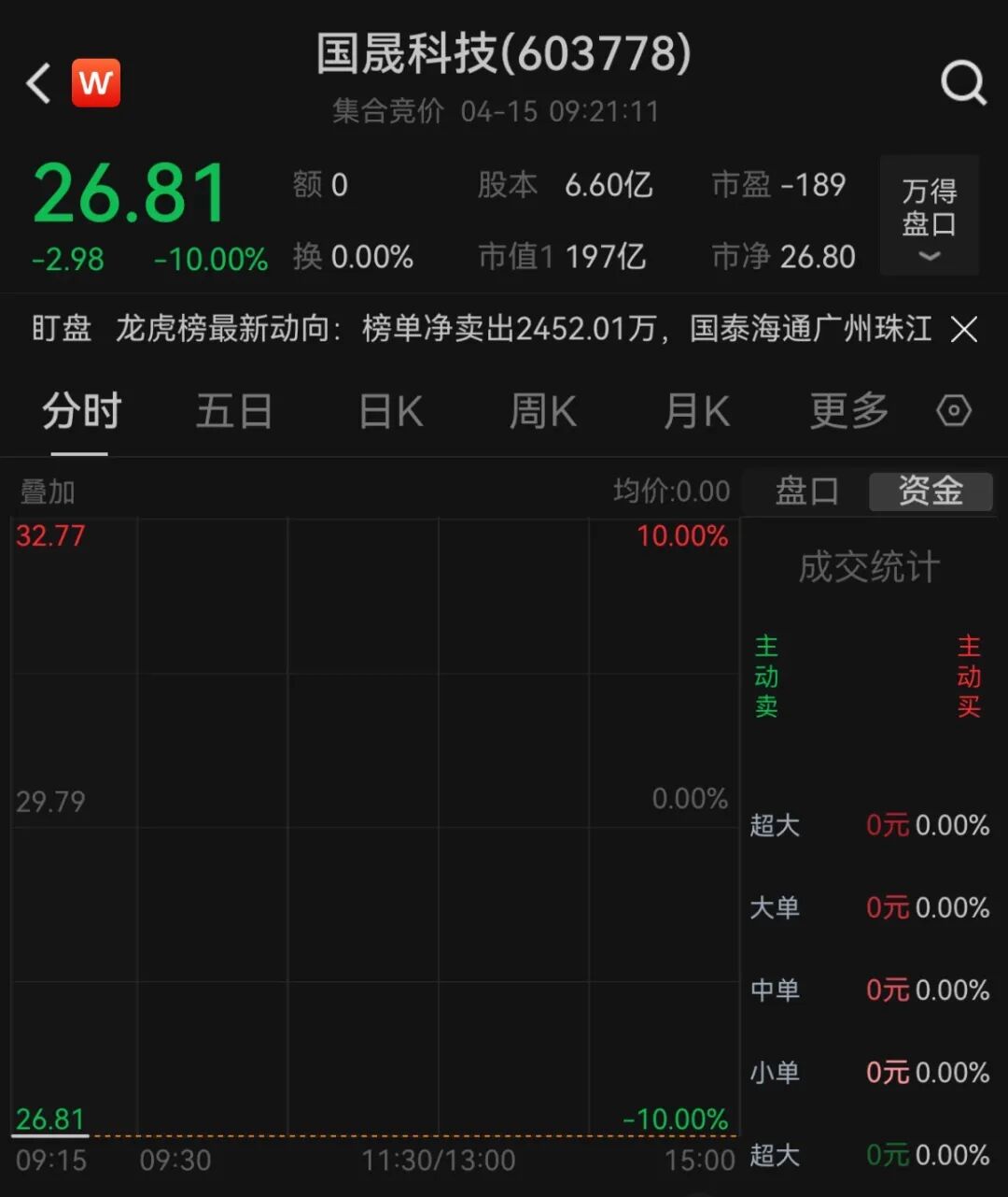 【大河财立方消息】4月15日,国晟科技(603778.SH)再次一字跌停,报26.81元/股。此前一日,已收一个一字跌停。