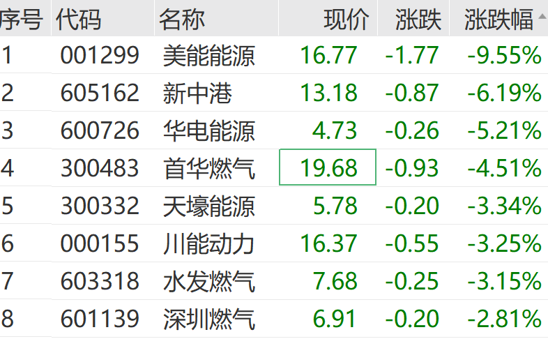 燃气板块同步走低,美能能源逼近跌停,新中港、华电能源、首华燃气等纷纷走低。