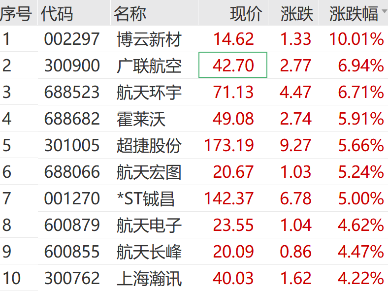 另外,上午商业航天、大飞机等概念股走强,博云新材涨停,航天环宇、航天宏图、航天电子等多股跟涨。