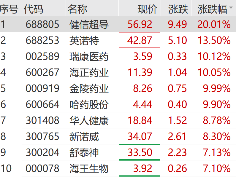 个股方面,健信超导走出20cm涨停,瑞康药业、海正药业、金陵药业、哈药股份等多股涨停。