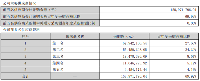 公司的优惠政策吸引了供应商。年报显示,北纬科技前五名供应商合计采购金额为1.59亿元,占年度采购总额比例达69.92%,其中前两名供应商占比合计达到52%。