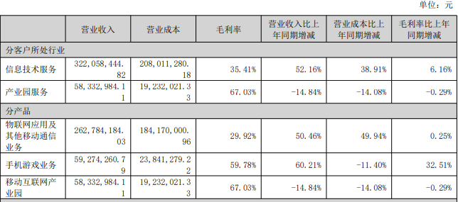 不过,尽管物联网业务规模居首,但其毛利率为29.92%,较手机游戏业务59.78%的毛利率低29.86个百分点。且手机游戏业务毛利率同比提升32.51%。