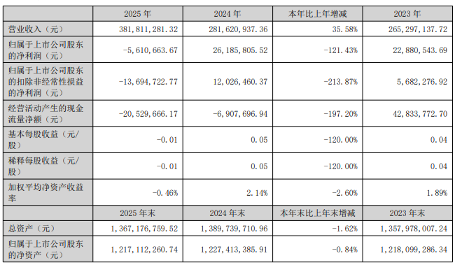 4月15日,北纬科技(002148)发布年报。2025年,公司实现营业总收入3.82亿元,同比增长35.58%;归母净利润亏损561.07万元,上年同期盈利2618.58万元,同比减少121.43%;扣非净利润亏损1369.47万元,上年同期盈利1202.65万元。