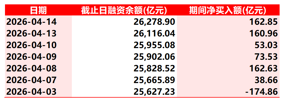 具体来看,4月7日至4月14日的6个交易日内,A股融资余额从2.563万亿元攀升至2.628万亿元,累计增长约650亿元。期间,在4月8日、4月13日和4月14日,单日融资净买入均超过了160亿元。