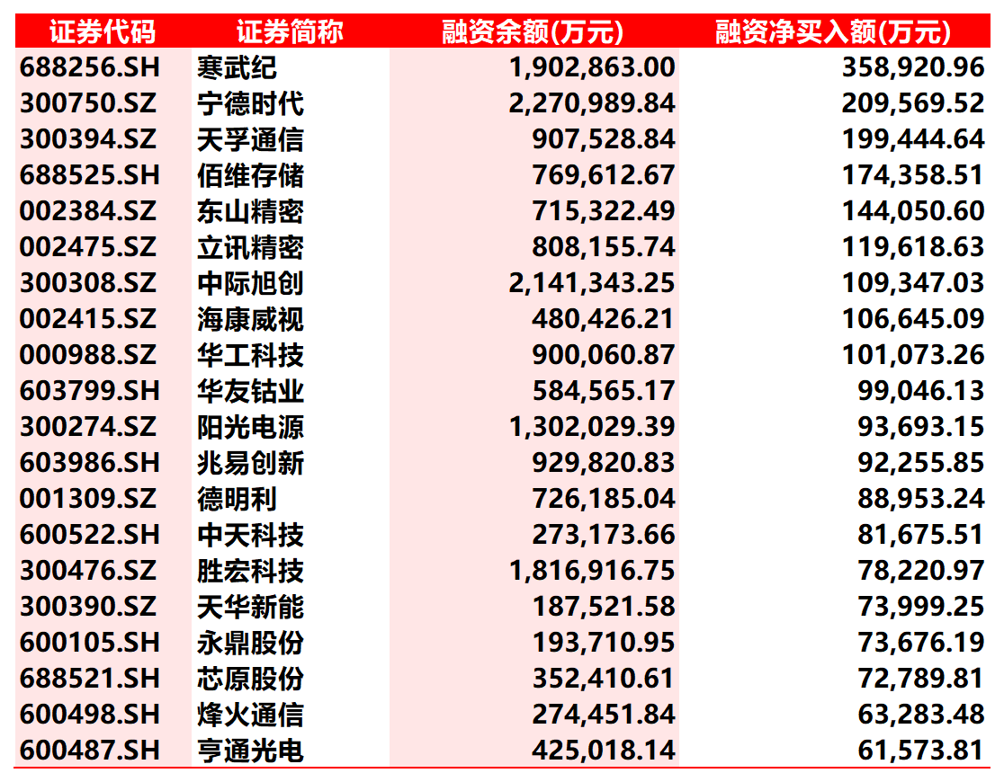 个股来看,4月以来,寒武纪、宁德时代、天孚通信、佰维存储、东山精密等个股融资净买入额居前,其中寒武纪净买入达35.89亿元,相对其他个股大幅领先。