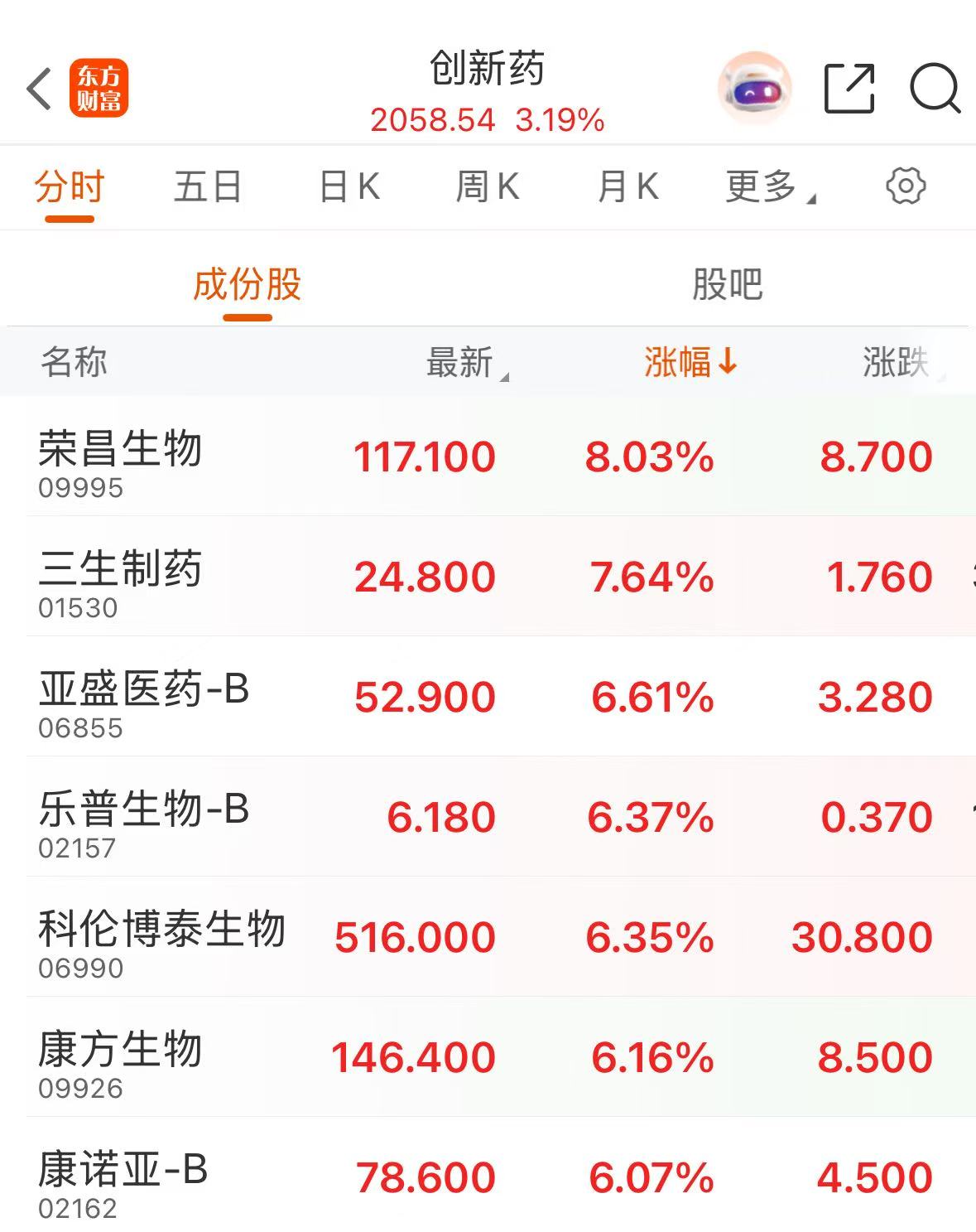 上证报中国证券网讯(林铭溱记者刘逸鹏)4月15日,港股创新药概念股午后走高。截至13时38分,荣昌生物涨8.03%,三生制药涨7.64%,亚盛医药-B涨6.61%,康方生物涨6.16%,科伦博泰生物涨6.35%。