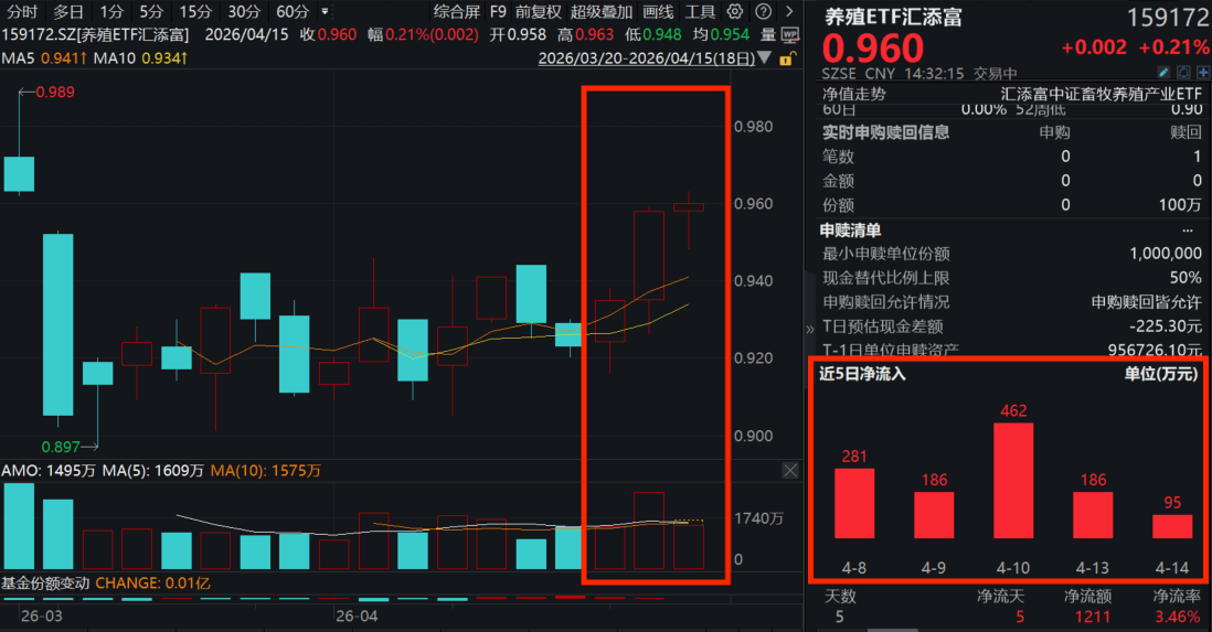 今日(4月15日),受国际地缘风险边际缓和影响,隔夜美股收涨带动全球风险偏好回升,A股三大指数集体高开,养殖板块震荡飘红。养殖ETF汇添富(159172)继昨日大涨2.46%后今日再度飘红,冲击三连阳!盘中成交量已超1500万元。资金已连续5日净流入,累计“吸金”超1200万元!